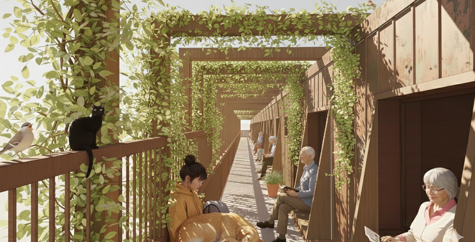 Vote for us! https://lnkd.in/eiqQ42Vp Ons project is een sociale en duurzame oplossing voor het woningtekort. We behouden de wijken door compacte, volledig zelfstandige woningen van 30 m² en 50 m² op platte daken toe te voegen. De nieuwe constructie is gemaakt van lichtgewicht staal met een koperachtige uitstraling. Dit onderhoudsarme en recyclebare materiaal is een milieuvriendelijk alternatief, en de kleur verwijst naar traditionele rode bakstenen. Duurzaamheid en sociale cohesie staan centraal in ons ontwerp. Zonnepanelen maken de nieuwe woningen en het bestaande gebouw elektrisch zelfvoorzienend. Groene daken en pergola’s zorgen voor verkoeling, waterberging en herstel van de stedelijke biodiversiteit, met beplanting voor bijen en insecten, die in steden met uitsterven bedreigd worden. Een nieuwe lift maakt het gebouw nu volledig toegankelijk. De doorlopende wandelroute met bankvormige vensternissen stimuleert ontmoetingen en vergroot de buurtcohesie. Ten slotte biedt de toegevoegde ruimte op de begane grond nieuwe kansen voor de buurt met sociale ruimtes, winkels of werkplekken, wat de wijk nieuwe vitaliteit geeft. Ons ontwerp kan worden toegepast op elk gebouw met een plat dak en elke locatie, waardoor het economische, sociologische en culturele meerwaarde genereert voor het hele land.